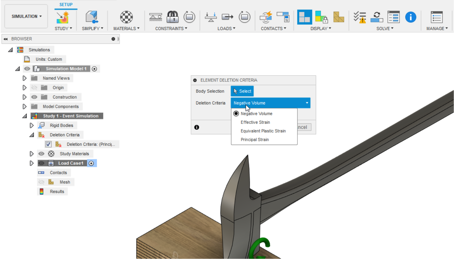 Previously, in Event Simulation, the Allow Element Deletion option in settings would add deletion criteria of NEGVOLUME and EFFSTRAIN to all parts of the model which might not be needed for the user. With the latest update, we have added Element Deletion Criteria as a separate dialog which will allow the user to specify the bodies to which the Element Deletion Criteria should be applied. We have also added additional choices in the Deletion Criteria which now allows the user to choose between Negative Volume, Effective Strain, Equivalent Plastic Strain and Principal Strain.