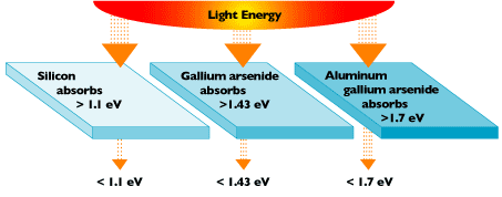 Silicon is only optimized to capture a particular frequency band of photons. For example, some photons that hit a silicon-based cell don’t have enough energy to knock electrons loose. Other photons might have too much energy and will knock an electron loose, but any excess energy is wasted in the process. There is only a precise amount of photon energy, measured in electron volts (eV) that is required to knock an electron loose. For silicon, about 1.1 eV will get the job done. Any photon energy above and below this threshold ultimately winds up as wasted potential.