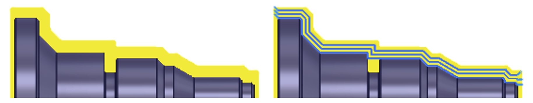 Now in the Rest Machining option for Turning strategies, you have ability to select “From setup stock” as the Source. You’ll be able to use cast and forged solid models for the Setup stock reference, and it will create toolpaths only in the places that are needed. This will yield higher efficiency and reduce cycle times. For example, The yellow below represents the solid stock model. Regardless of the number of step-overs specified, only 3 step-overs will be generated to machine the remaining stock.