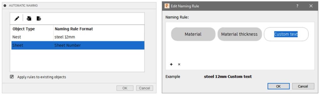 We’ve improved the naming convention for Nest & Sheet nodes to be automatic and rule-based. Now Fusion 360 will update the names of all nests and sheets in the browser and Nest Reports when a change is made. Naming rules are also stored in the Assets folder, meaning every team member in your team hub can have access and share the same naming rule for the project.