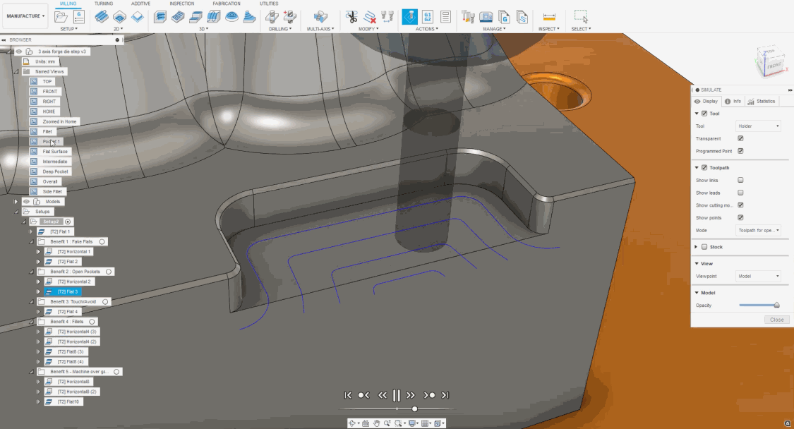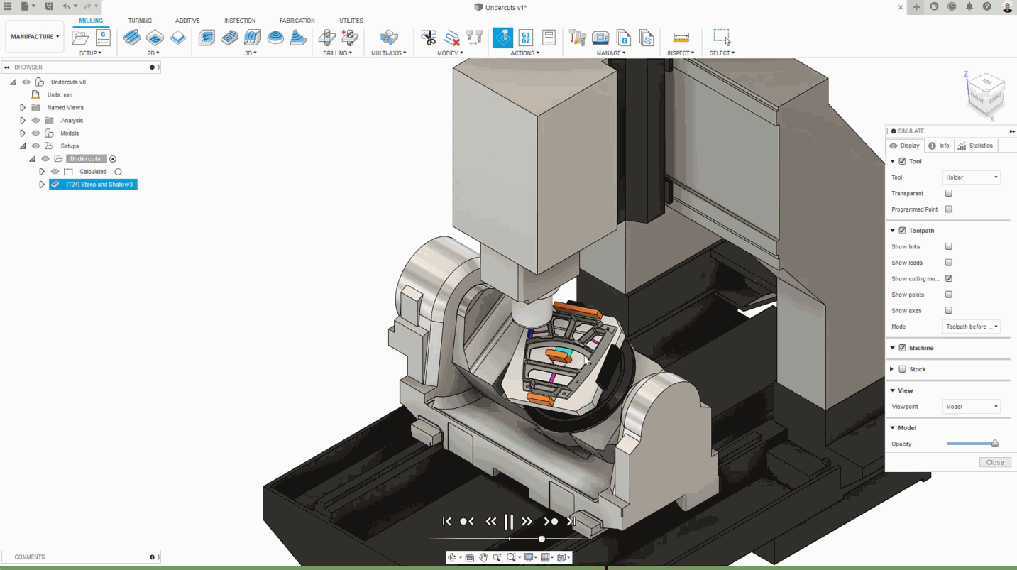 Now available to try for free is the ability to machine areas that were previously unreachable (undercuts) due to overhanging geometry. By setting your threshold angle at 0, you’ll now be able to use Steep & Shallow and reach those pesky areas in a single operation. This will work in 5 axis with Automatic Collision Avoidance, as well as 3 axis with lillipop, disc, or dovetail cutters.