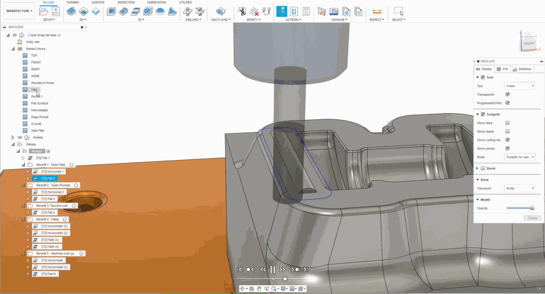 Enabling the Fillet option within Flat Finishing strategy enables the tool to machine sidewalls to the programming size, but also makes it roll around the corners to avoid over engagement.