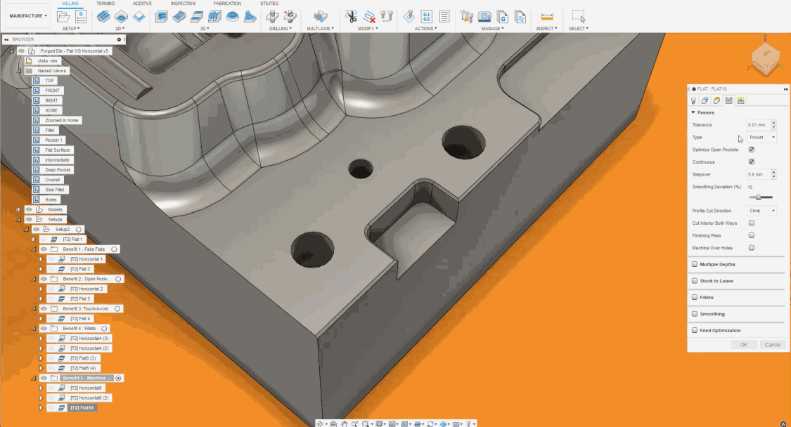 Flat finish strategy recognizes filleted surfaces and machines around them, instead of incorrectly interpreting them as false flat surfaces, like the Horizontal strategy does.