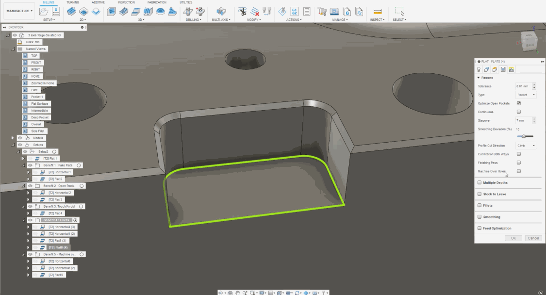 Flat Finishing now has the option to machine over holes with “machine over holes” button, leaving you a more efficient toolpath as well as better surface finish.