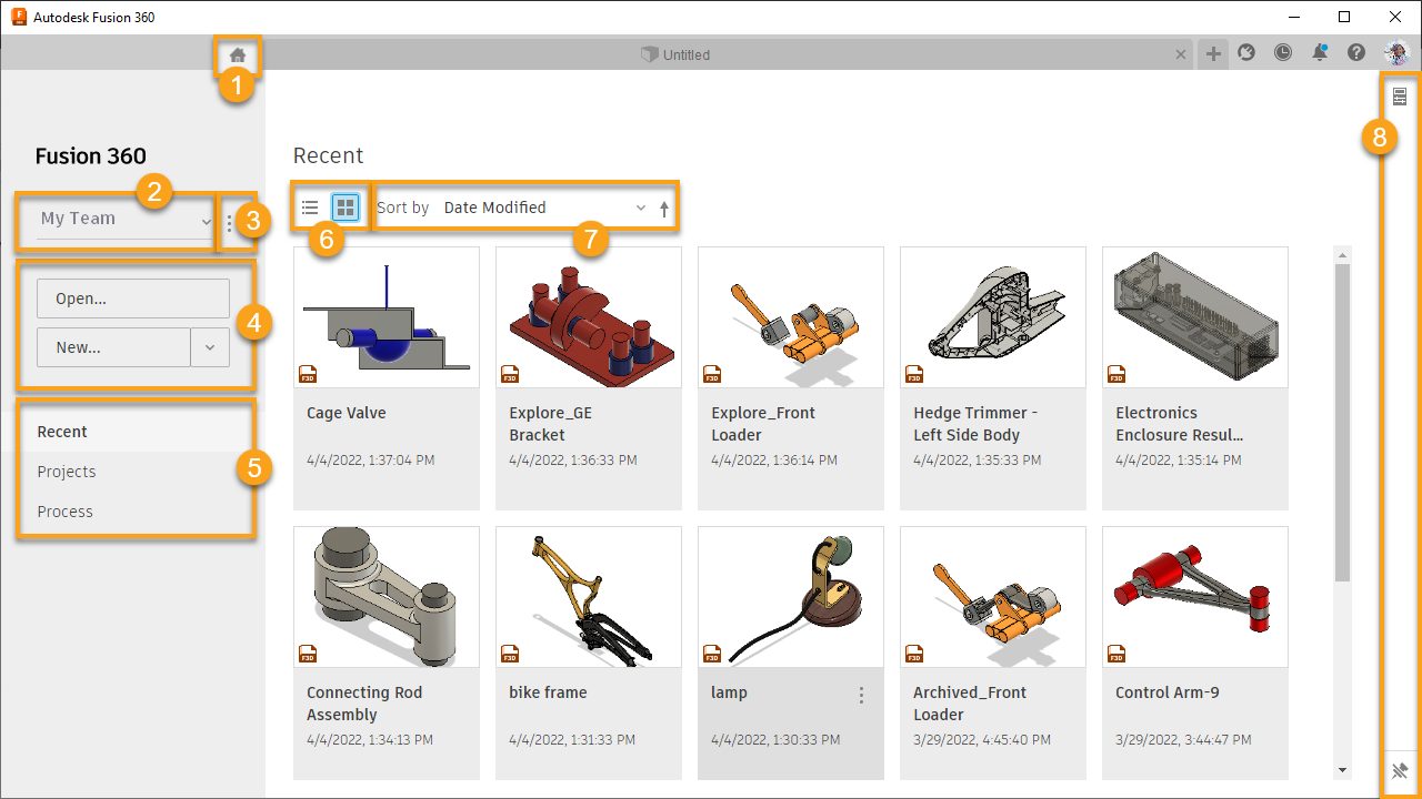 With Fusion Home, you can start something new, look through recent work, review file properties, switch between a list and thumbnail view, and much more. Here’s a quick tour of the UI: