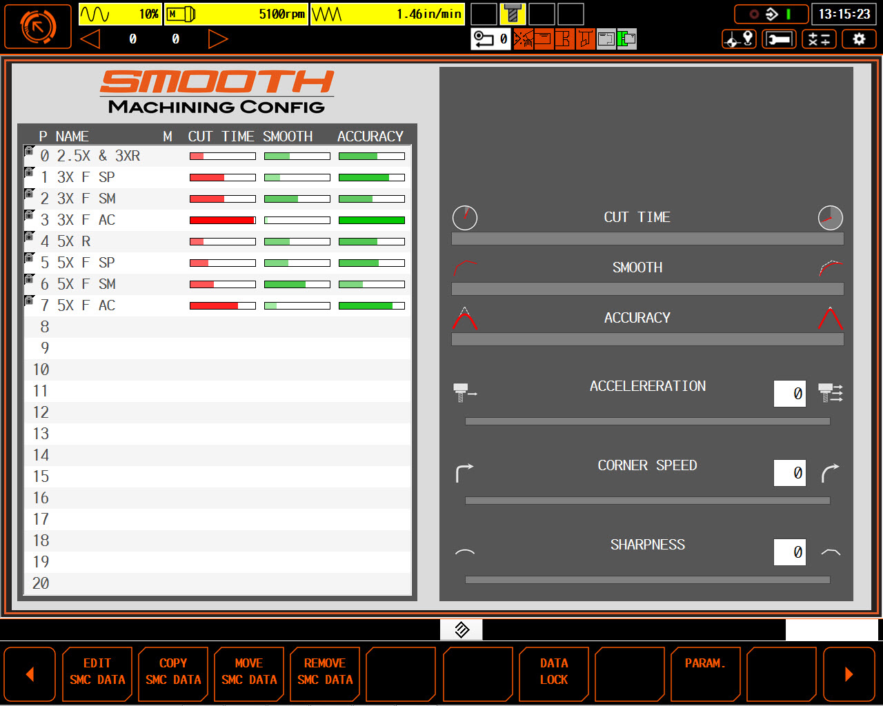 You might see this setting named differently depending on your machine, but it all comes down to balancing acceleration and deceleration with accuracy and rounding corners. A good way to visualize how high speed machining and smoothing works is with a race track. If you make the race track lane wider, than a vehicles can go faster through corners without needing to decelerate.
