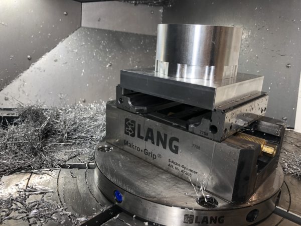 During the first setup, I held the billet using a Lang vice. This exceptional tool allows for reliable and vibration-free holding, even though it requires just 3 mm of material for clamping. This meant I could order the billet just slightly oversized, a significant reduction in size compared to the larger block of stock I had initially defined. Another great benefit of using a Lang vice is that, when removing the component and placing it back in the vice, it allows for part re-alignment within a 5-micron tolerance. This makes the process extremely reliable and repeatable, for example, if you plan on cleaning up multiple billets before starting to run your toolpaths on one of them.