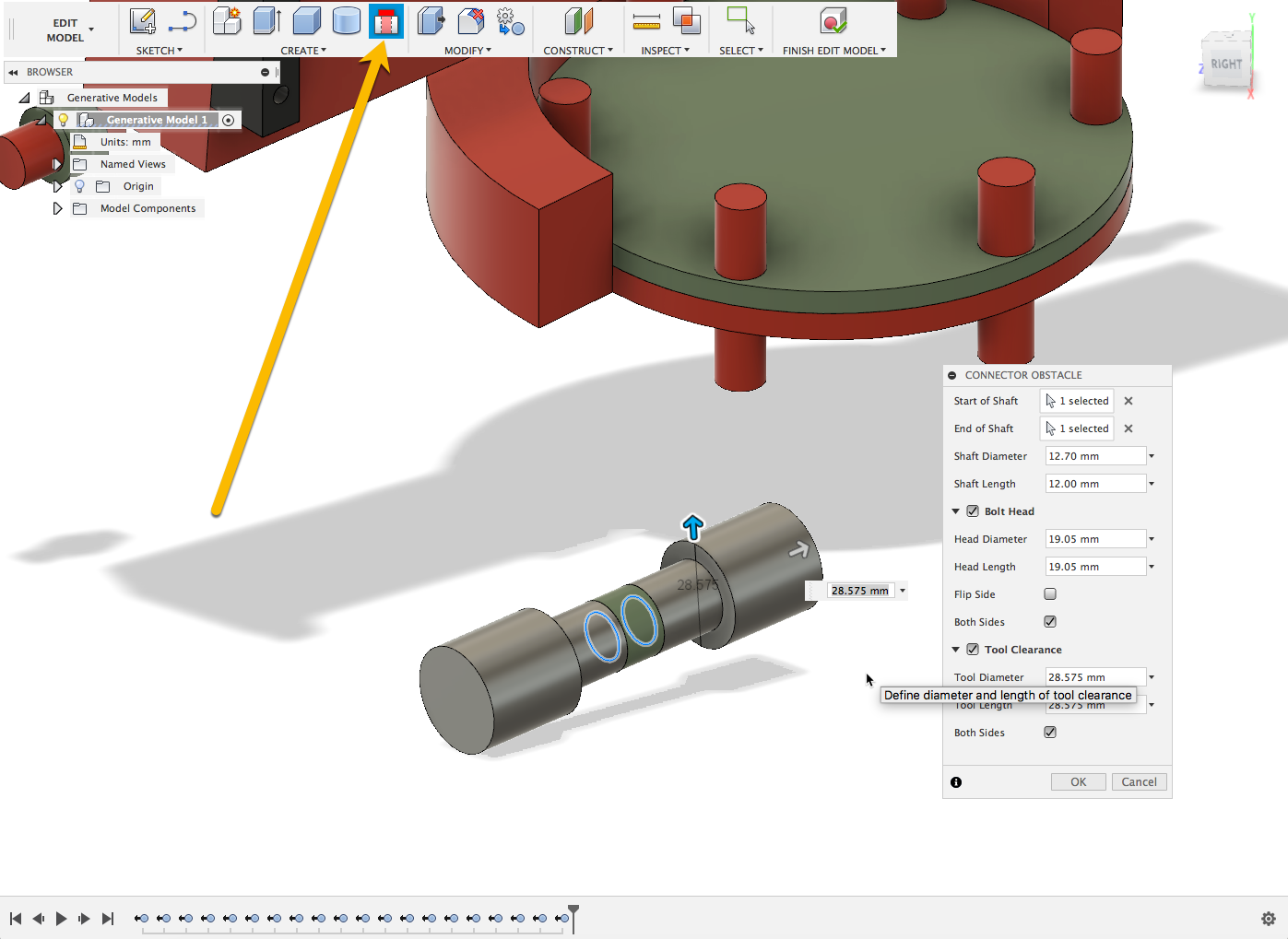 In the Edit Model workspace, using the Connector Obstacle tool, you will now be able to model these types obstacles by simply selecting edges on the model where you want a connector. The tool will allow you to define size properties for the connector itself, as well as tool clearance dimensions. You can leave all of those combinations of sketches, extrudes and mirrors to create these types of obstacles in the past.