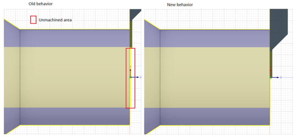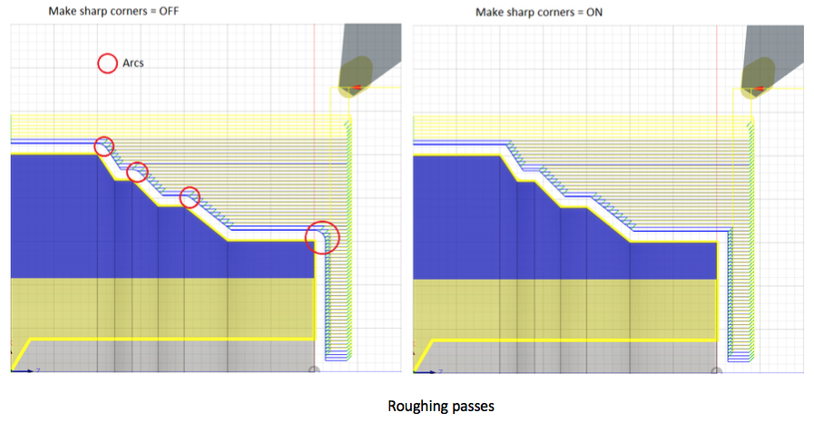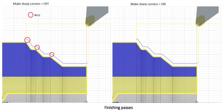 You can now control the shape of the profile turning tool-path at convex corners using the parameter “Make sharp corners” in the Passes tab. When this parameter is checked off, convex corners in the tool-path are smoothed with arc moves. When this parameter is checked on, convex corners in the tool-path are machined without arcs and ensures that outside corners are sharp and not rounded.