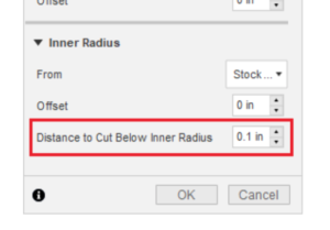 A new parameter called “Distance to Cut Below Inner Radius” is now available within the “Radii” tab. This parameter allows your grooving tool to go a certain distance below the inner radius in addition to the tool nose radius to remove any micro nubs resulting from the facing portion of the groove finishing operation.