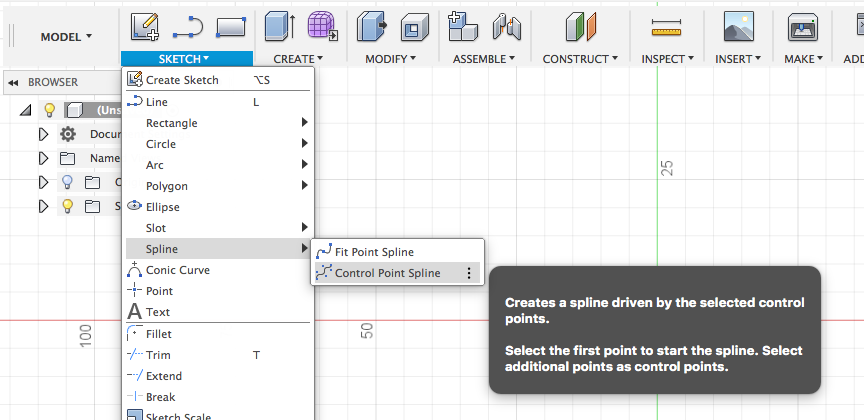 We talked about this in past roadmap updates and blog posts, and now itâs here. When youâre in Sketch mode, youâll now be able to create splines with control points. Yes, it does exactly what you think it does! It gives you a new way to control the curvature of your spline. When youâre in the command, a point is created every time you click on the sketch plane.