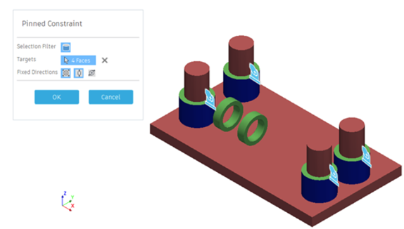 This new constraint type will allow you to prevent the target cylindrical face from moving or deforming in the radial, axial, or tangential direction. Apply it to the selected cylindrical face, based on a cylindrical coordinate system. If you apply the Radial pinned constraint, nodes along the cylindrical face canât move or deform radially.