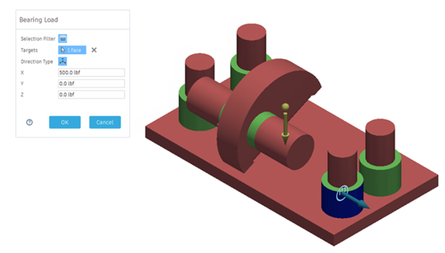 Assign a bearing load as a force of the specified magnitude applied to the selected cylindrical face or faces using a parabolic distribution. Youâll need to specify the magnitude of the load for the appropriate vector components. Note that the bearing load vector can’t be coaxial to the cylinder axis.