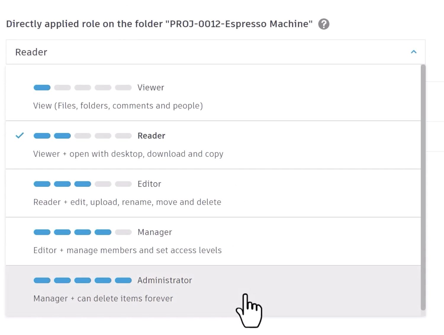 - Manager (New): This new role permits a member to manage users without having full admin privileges to permanently delete files. This permission was combined with the previous project admin role.
