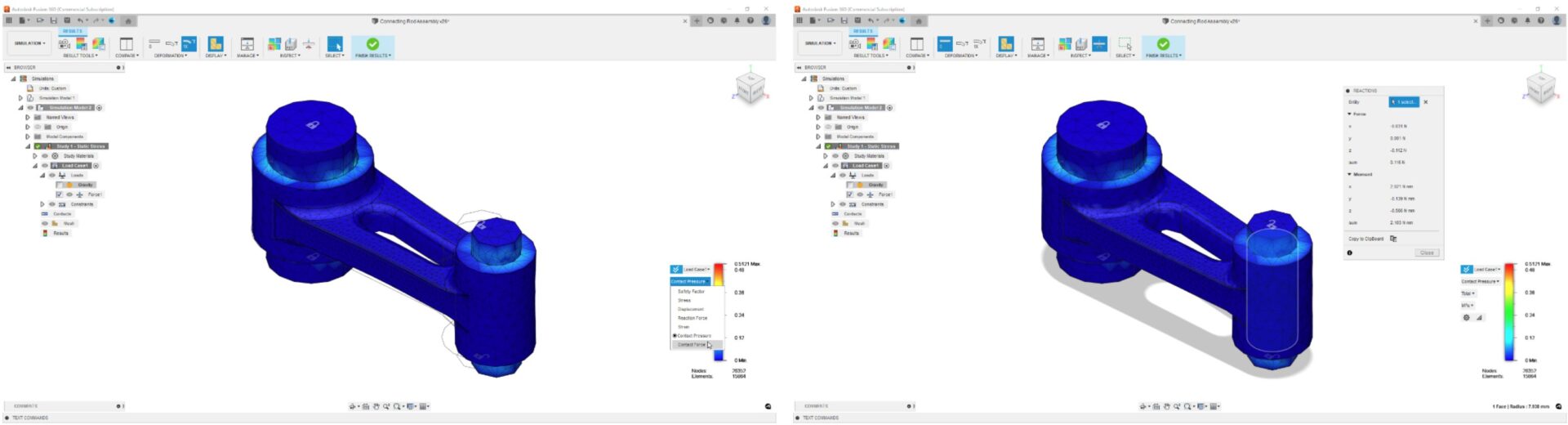 We have added 2 new result visualizations for Contact Force and Contact Pressures (left picture). We have also added enhancement where the user can now get Reactions data for Force and Moment at Contact locations as well (right picture). These Reaction values can then be used as a reference when setting up a Generative Design Study.