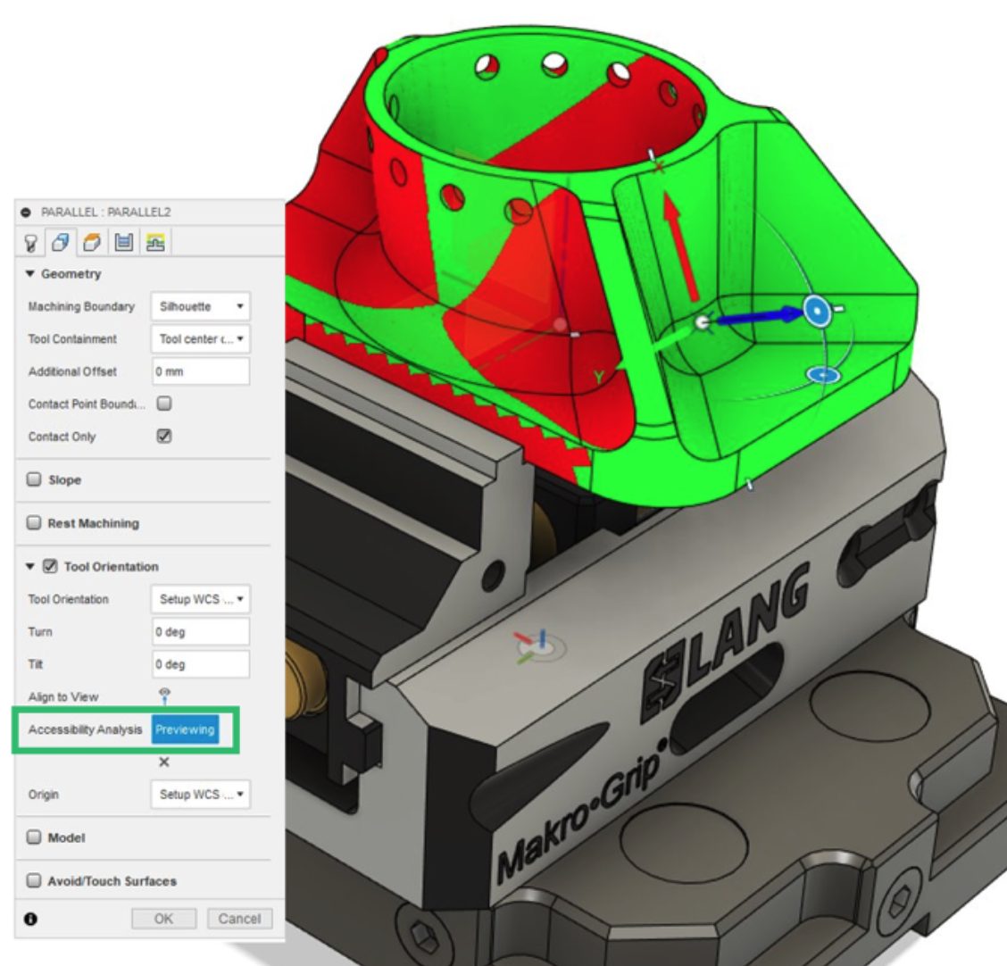 Now when you are working on tool-path strategy, there is a new option under the Geometry tab > Tool orientation called Accessibility Analysis. This shading option gives you a preview what areas of the part are less accessible by the cutting tool. It is aligned with selected tool orientation. It will update as the tool orientation changes.
