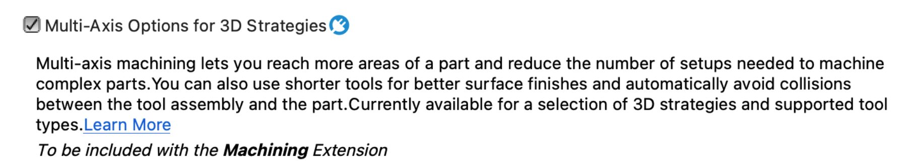 This new Machining Extension preview enables you to try new multi-axis options for 3D strategies. You’ll be able to Reduce number of setup’s, avoid costly fixturing, use shorter tools, achieve better surface finish, have less tool deflection, and setup more optimized feed-rates.