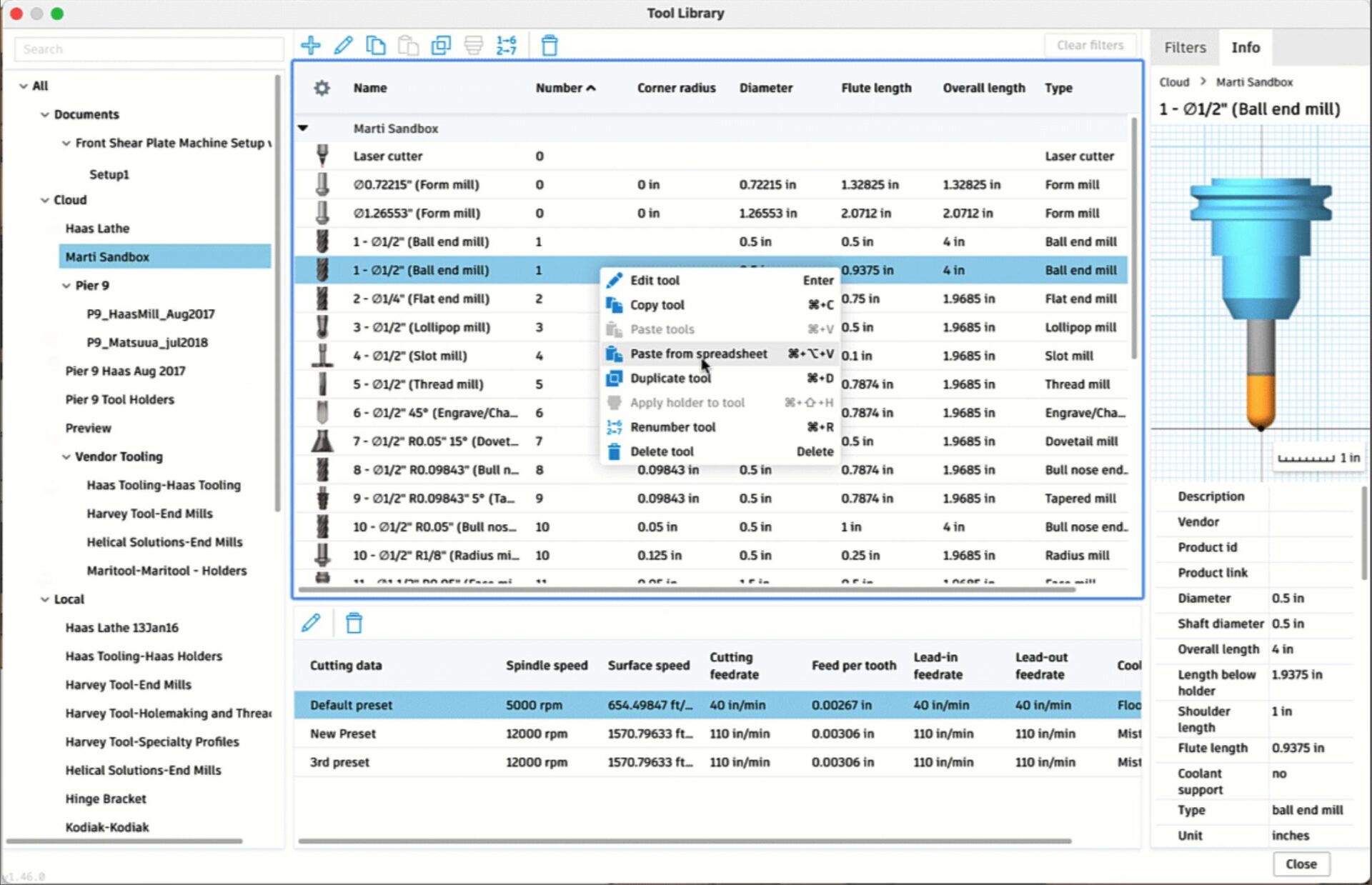You now have the ability to import and export tools from the tool library through management in spreadsheet apps (for example Excel, Google Sheets). Management activities might include bulk editing, bulk creation of cutting presets, and other automation workflows. Also, we added the ability to copy and paste selected tools between the tool library and the spreadsheet which gives the user more granular control over their libraries.