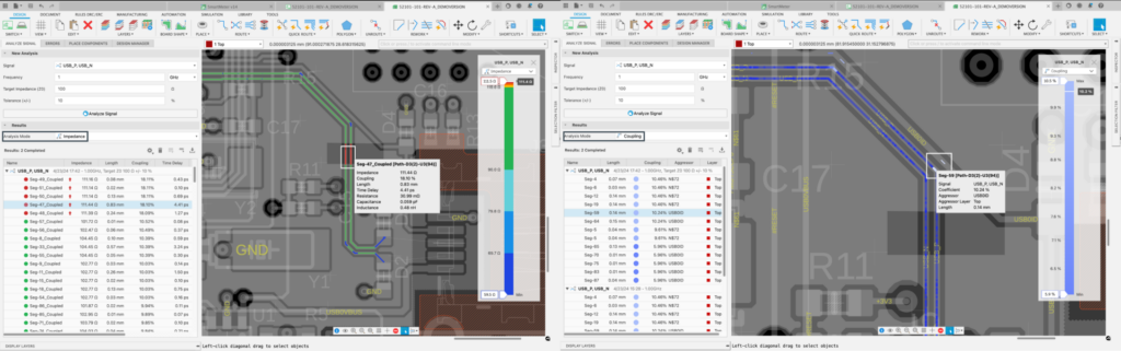 Leveraging our ongoing partnership with Ansys, we are excited to announce the latest enhancement in Signal Integrity simulation available in the Autodesk Fusion Signal Integrity Extension powered by Ansys. You will notice that it will now include differential impedance and coupling for the differential pair traces. This significant update, built upon our previous introduction of impedance capabilities, now offers a refined analysis mode for the pair. Ensuring that the differential impedance is correctly designed and maintained is critical to achieving good performance in circuits that use differential signaling, especially in high-speed digital electronics where even minor discrepancies can significantly impact the performance. Switching to the Coupling mode will measure the coupling coefficient of the pair against aggressor signals, which is crucial for understanding crosstalk effects on your signals. You are now empowered to compute Differential Pair Impedance simulations with the same ease and precision as single-ended signals. This innovative feature is readily accessible through the Analyze Signal Panel, enabling a streamlined and powerful new simulation experience.