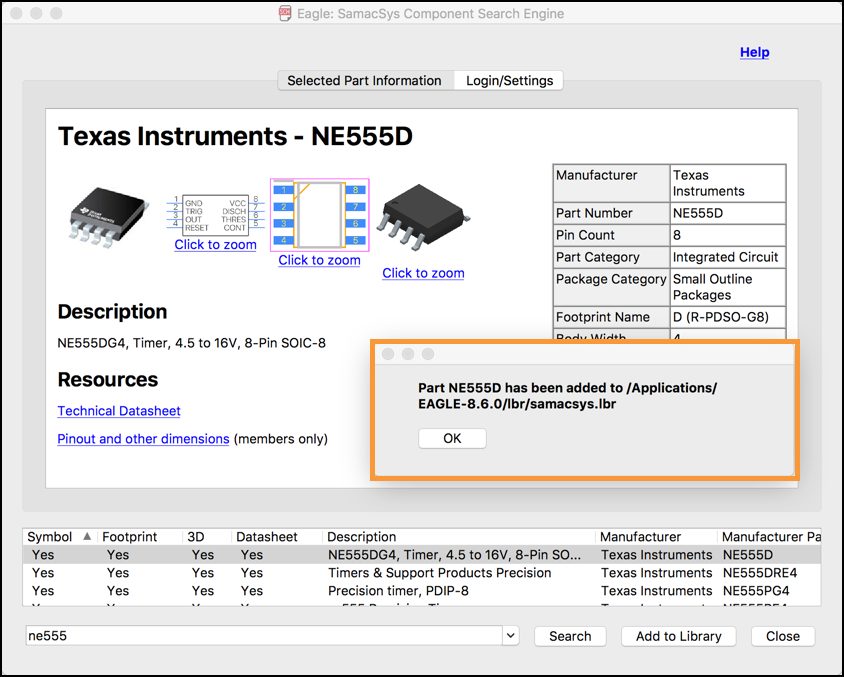Nearly every part includes a free symbol, footprint, 3D model, and datasheet as shown above. To add a part to your personal library, all you have to do is select the Add to Library button at the bottom. You’ll get a confirmation dialog after doing so: