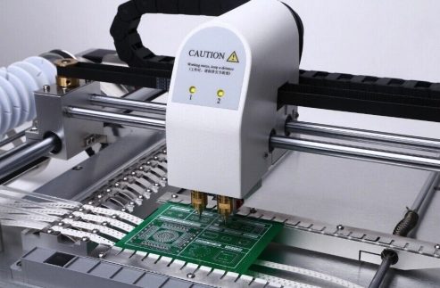 A pick-and-place machine throwing down SMD components like it’s nobody’s business.