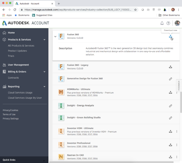 Simply go log into your Accounts page. Navigate to Product & Services » All Products & Services on the left-hand side and find Fusion 360. Click the Download Now icon.