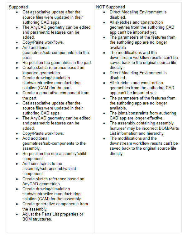 When inserting an Inventor part or assembly, these AnyCAD files are treated as External References, the geometries cannot be edited directly. However, when opening an AnyCAD part or assembly, its geometries and structures can be edited. You need to save the opened file as a separate Fusion 360 design to keep these changes. The table below shows what you can do to AnyCAD files in open workflow: