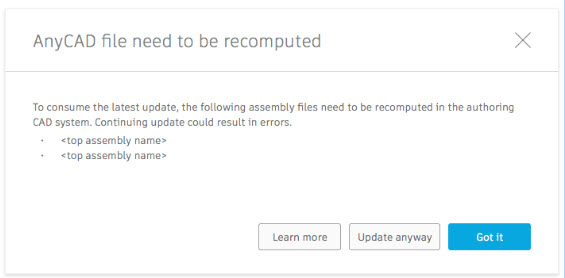 When you see the following dialog, it means the assemblies need to be updated in the authoring CAD software to make sure that Fusion 360 can process the data correctly.