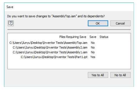 If you open and edit the Inventor .IPT file only, open the corresponding top assembly .IAM file after saving all the changes to the part file. You may see the pop-up dialog below: