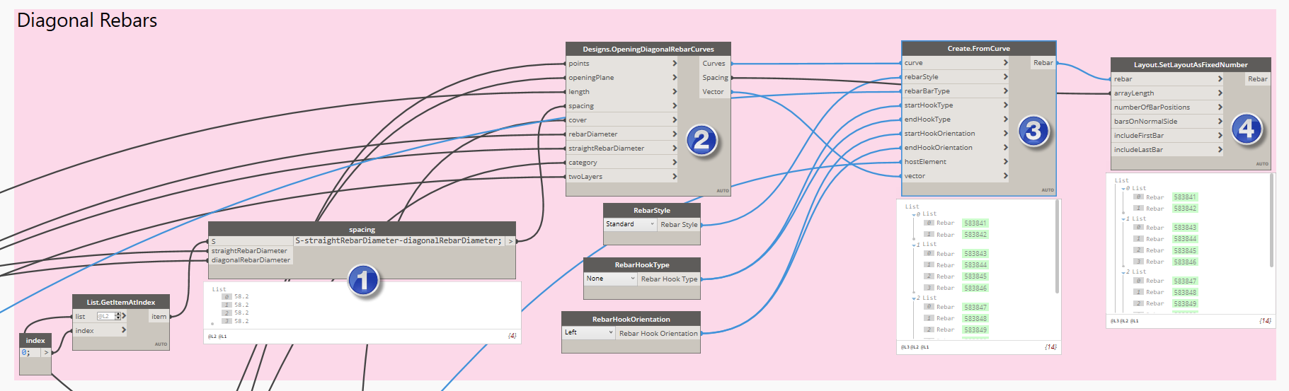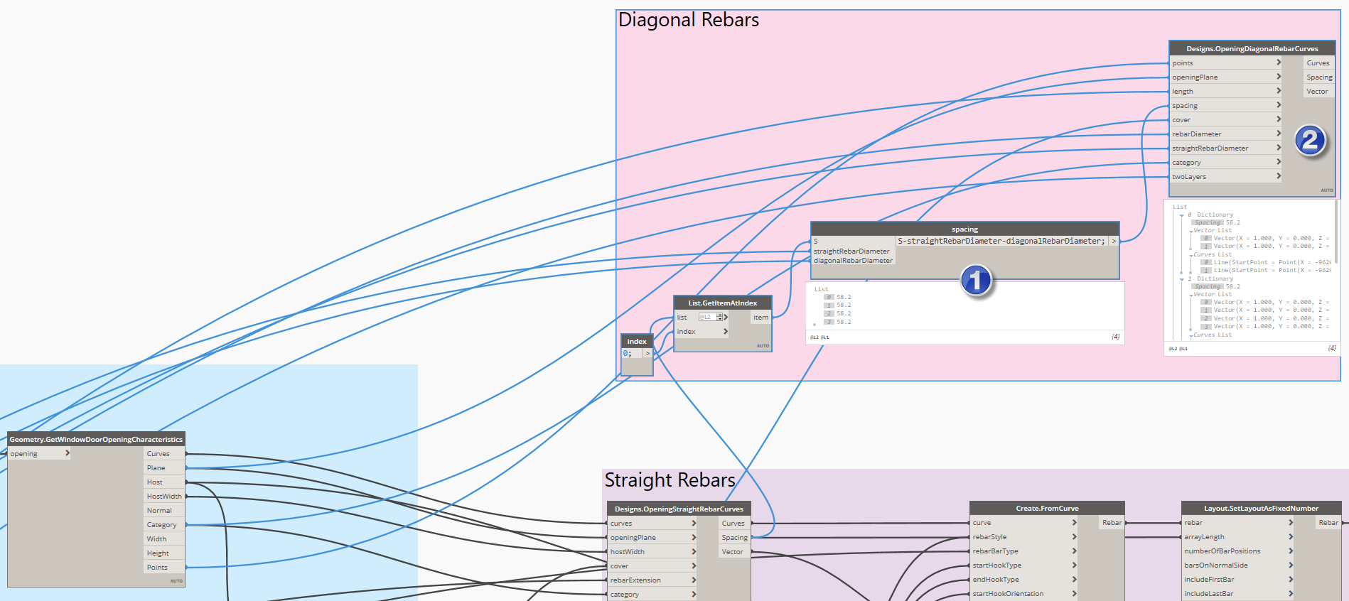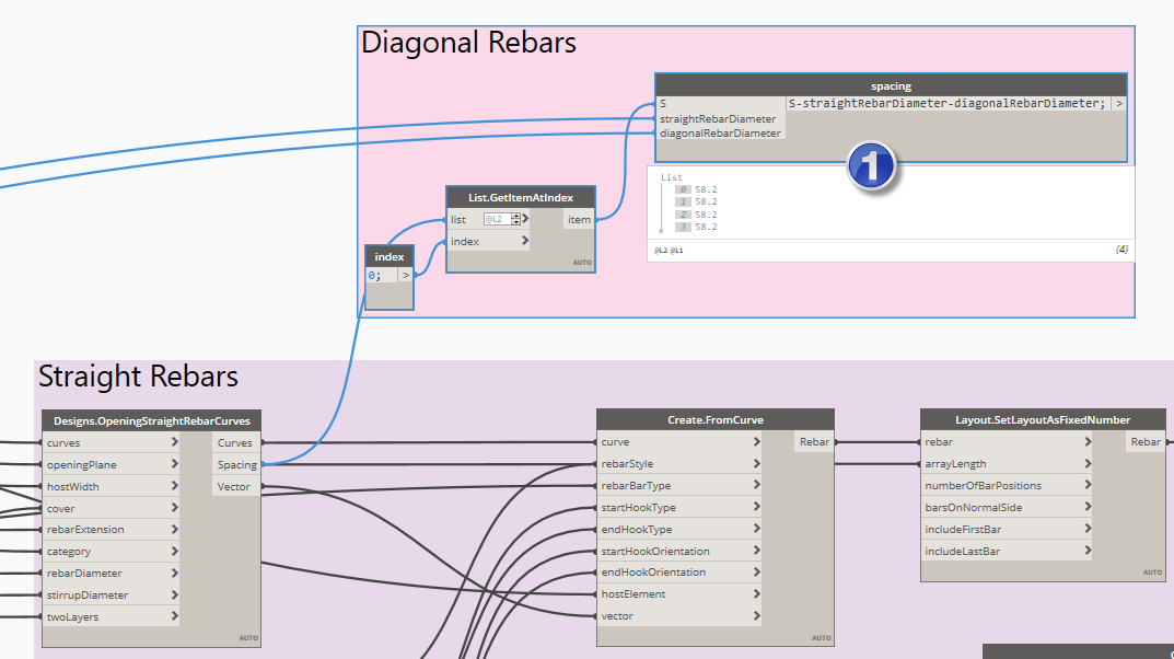 1) Before we wire the OpeningDiagonalRebarCurves node to the right data, we need to calculate a spacing between diagonal rebars.