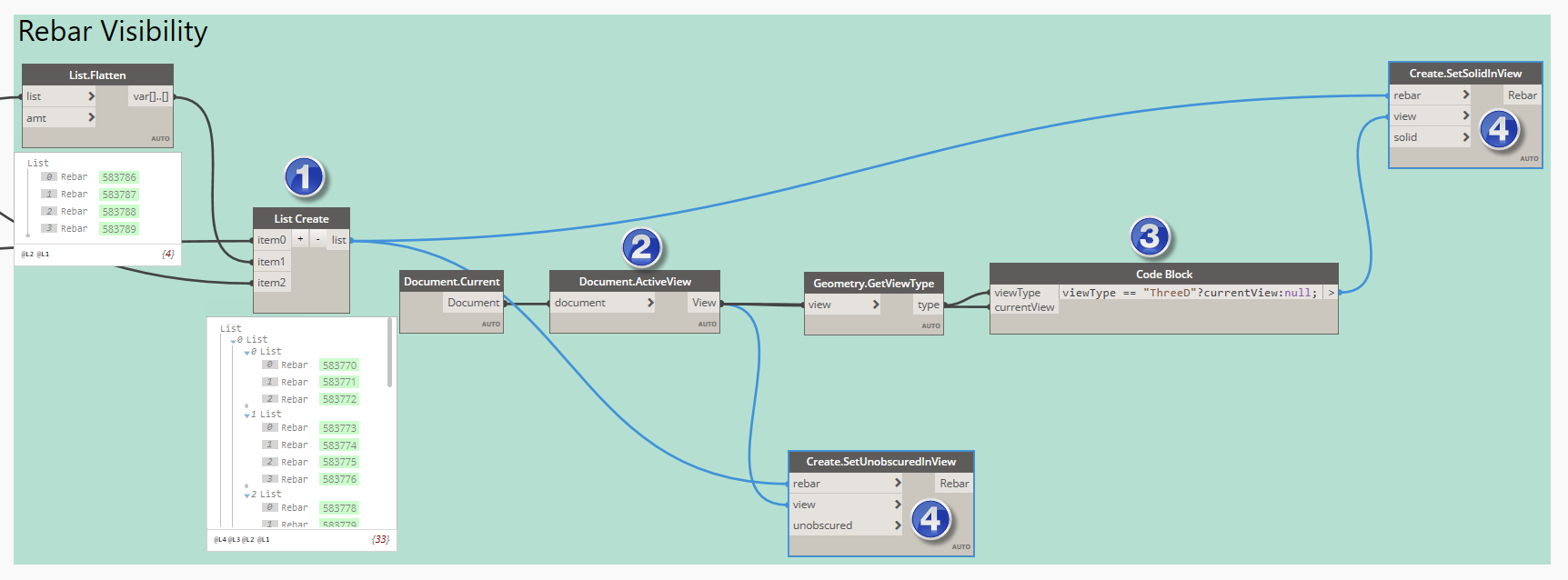 3) To set up rebar visibility we will use the SetUnobscuredInView and the Create.SetSolidInView nodes. The second node takes a 3D View as an input parameter, so we need to check if the current view is a 3D View.