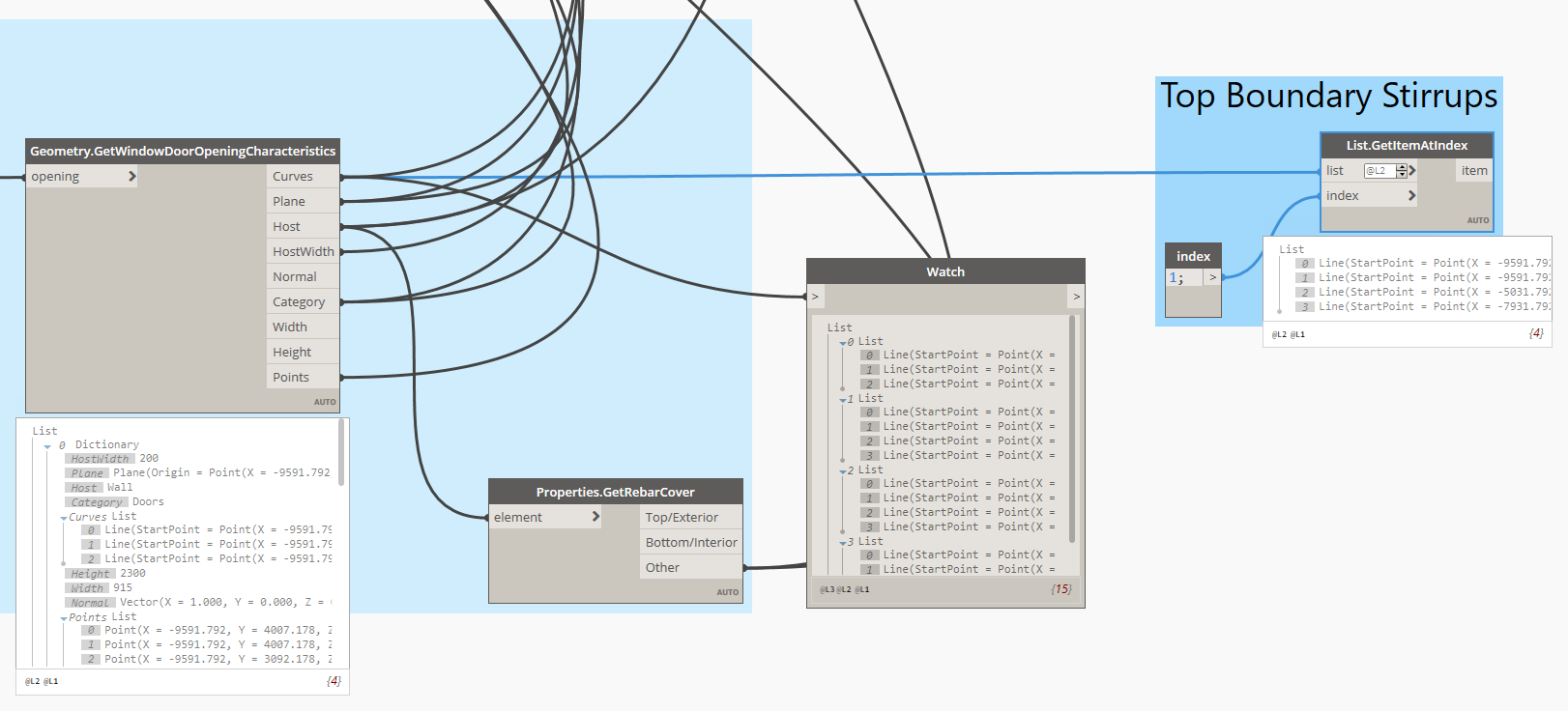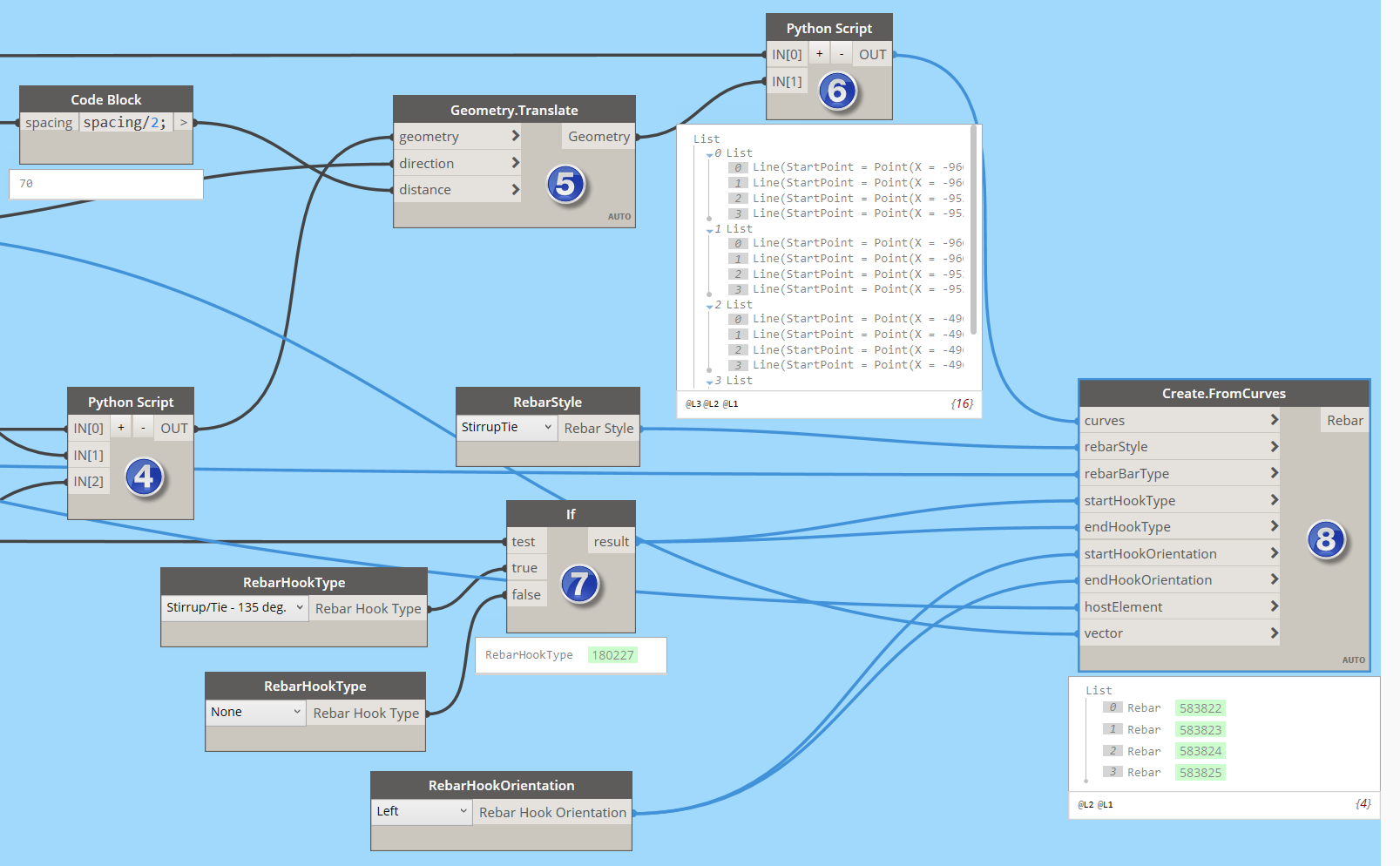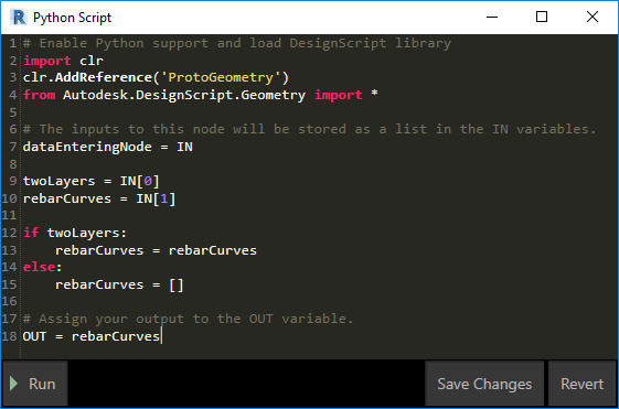6) Now we can create rebars in Revit, but before we do this we need to check if the creation of stirrups makes sense (if the Two Layers parameter is True). Again, in this case we will use the Python Script node and write a simple script.