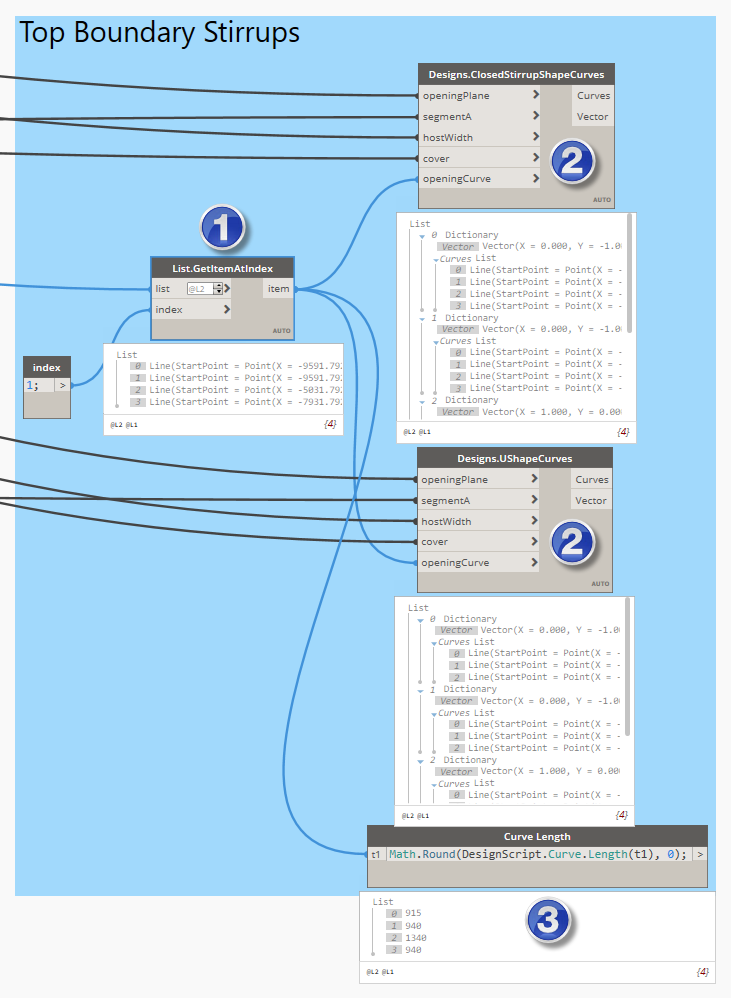 3) Later we will need the lengths of the curves so let’s get these values using the Design Script syntax.