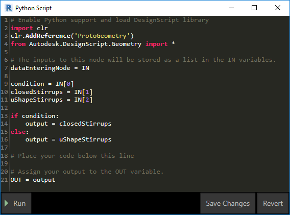 4) Having the stirrup geometry defined, it’s time to add a logic that will manage what kind of stirrup is used. We will do this using the Python Script. Our simple Python Script will return the result of the node’s inputs passed through an embedded IronPython script. We will define 3 inputs:
