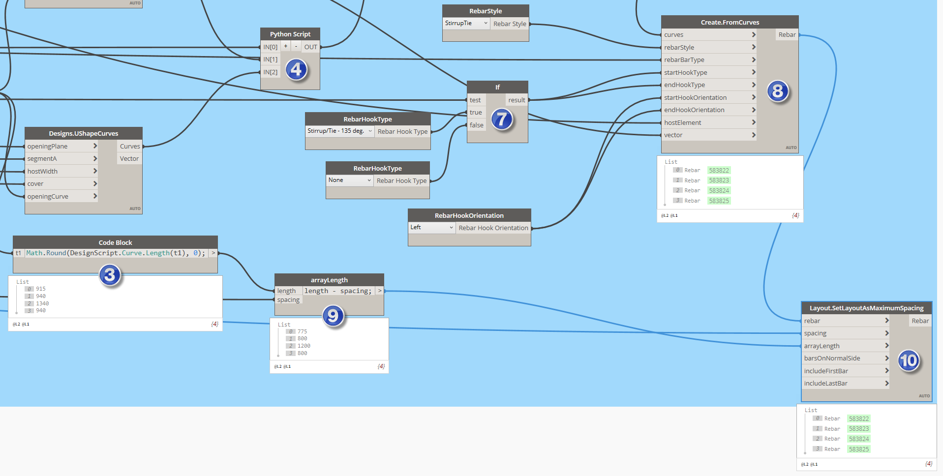 9) To define a rebar set from our stirrup we need to calculate arrayLength In this case again we can use the Code Block node to provide a formula and renaming the node we can call it respectively.