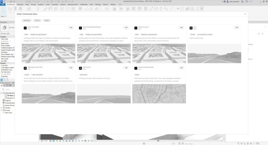 Revit users will also have access to purchase contextual data from the Forma Data Marketplace directly within Revit. Contextual data such as terrain, surrounding buildings, parcels and other data can quickly be sourced from external providers and added to design models. Making this more powerful is the shared geolocation data, which helps ensure the data that is ordered is also located properly without manual placement. Together, this real-world context gives designers a decision-making edge.