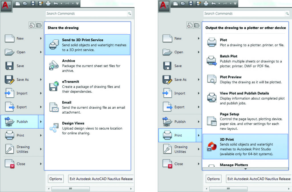 Prefer to use the ribbon? Click on the Output tab of the ribbon (3D workspaces only) and you’ll find Send to 3D Print Service and Print Studio (the new 3DPRINT command – for added confusion).