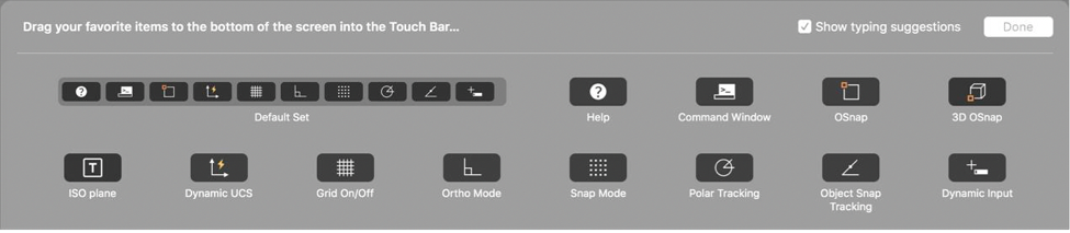 We actually introduced Touch Bar support in AutoCAD for Mac 2017.1, but we love it so much we didn’t want you to forget about it! If you have a MacBook Pro with a Touch Bar, you have even easier access to some of the top key function shortcuts. There are 10 default functions, but you can also customize the Touch Bar by adding from the list available.