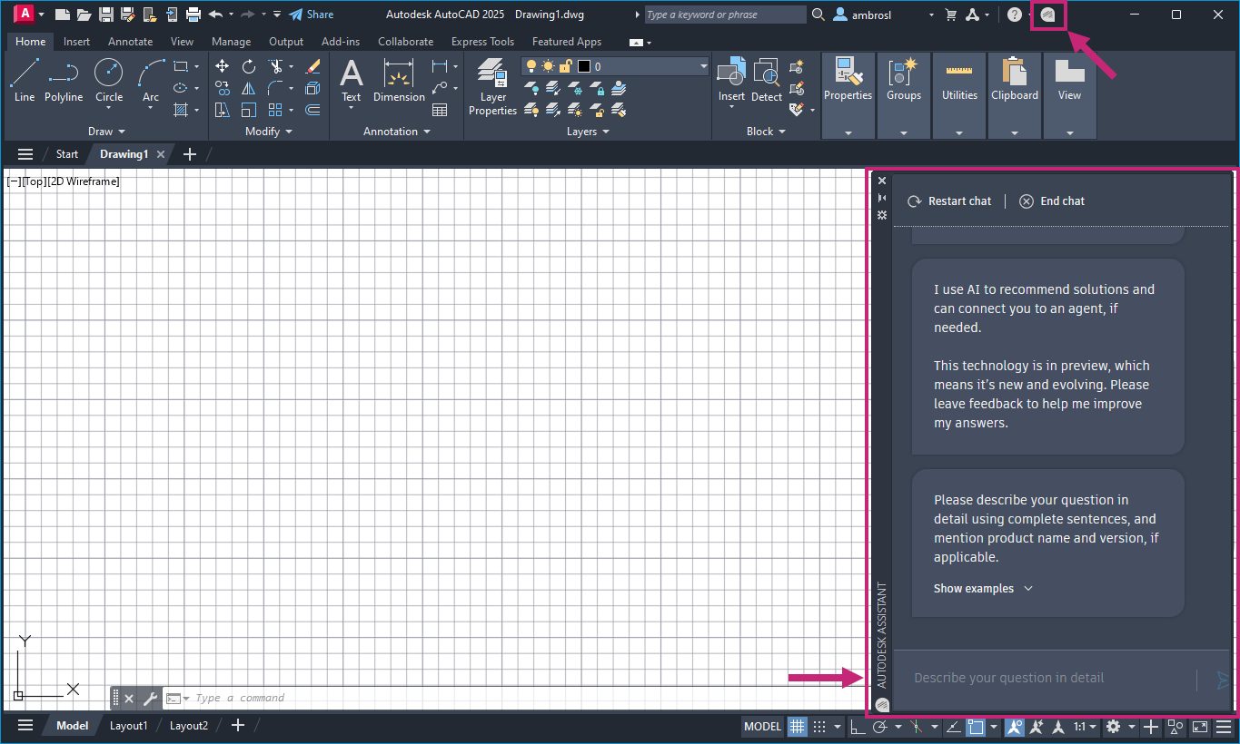 In the upper-right corner of the application window, on the InfoCenter, click Autodesk Assistant to open the Autodesk Assistant palette. With the palette open, simply type your question into the “Describe Your Question in Detail” field and press Enter to get a response. For an introduction on using the Autodesk Assistant, see the Introduction to Autodesk Assistant and AutoCAD Help topic in the AutoCAD Online help.