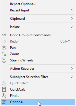To open the Options dialog box, type OP in the command line, or right-click in space (without anything selected), and choose Options from the right-click shortcut menu.