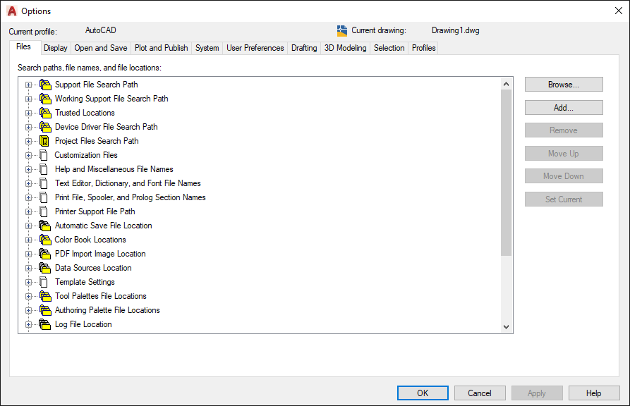 The Files tab is probably the most important one for standardizing the environment in your organization. All file locations are defined here, including AutoCAD templates, plot styles, sheet set files, and more.