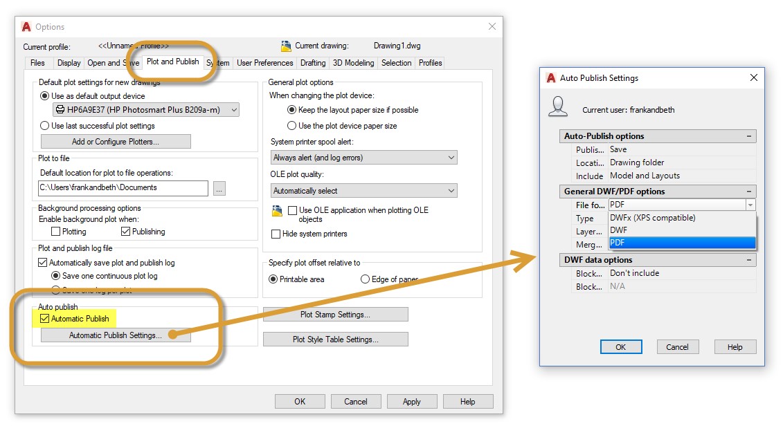 Diane, simply go to Options > Plot and Publish tab > check Automatic Publish > Set to PDF. It’s easy, and you have a lot of options available.