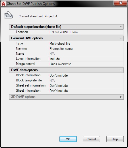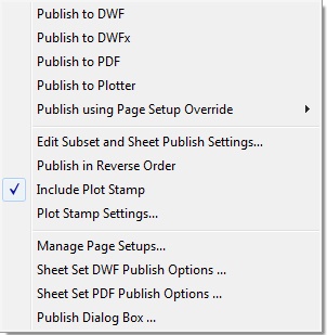 - Similar options are available if you right-click on the Sheet Set title and choose Publish>Sheet Set DWF Publish Options