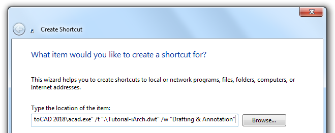 These steps explain how to create a custom desktop shortcut to launch AutoCAD or AutoCAD LT with a default drawing based on a specific drawing template file and to set the “Drafting & Annotation” workspace current.