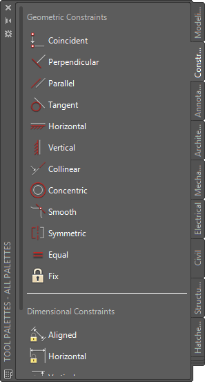 When you open Tool Palettes—accessed from the View ribbon tab or the TOOLPALETTES command (TP alias)—you’ll see several tabs. Each tab is a palette, itself with multiple tools. It’s unlikely that most of them are particularly useful to you, and they’re not intended to be. Rather, they’re intended to inspire you with ideas and examples. There is, for example, a Modeling palette with just a few of the tools you might use for 3D modeling. And there’s a Constraint palette with tools for applying parametric constraints.