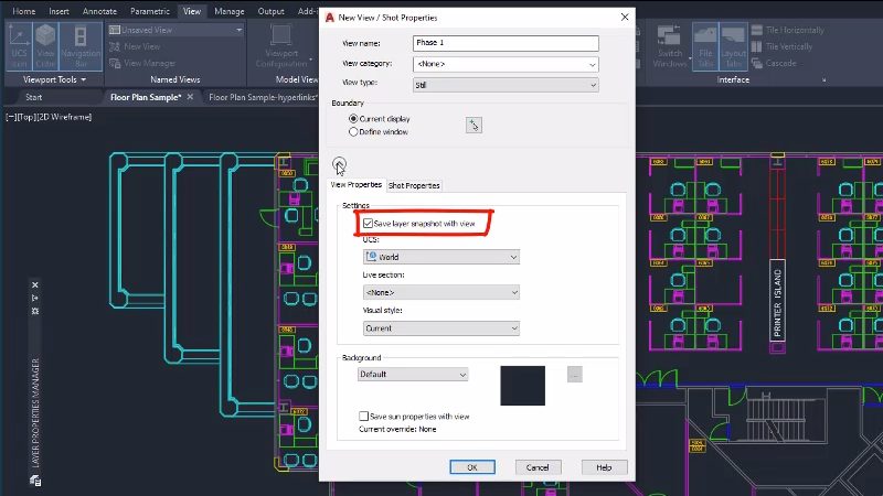 A view consists of a specific magnification, location, and orientation that you can save and assign a name. This is called a named view. Named views make it easy to return to a specific view of the drawing at any time. Specific layer visibility settings can also be included in a named view.