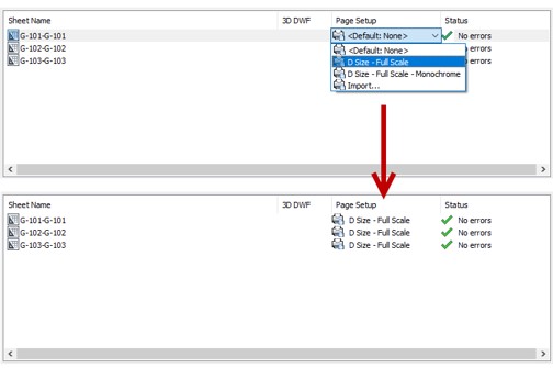 This brings us to section two, the Sheets list box, and another important control that’s not obvious. Each entry in the Page Setup column is also a pull-down list, containing all Page Setups in that drawing’s layout (or in Model Space, if that is your method). While you can set each independently, most often the set of sheets are a group that will typically all have the same settings.