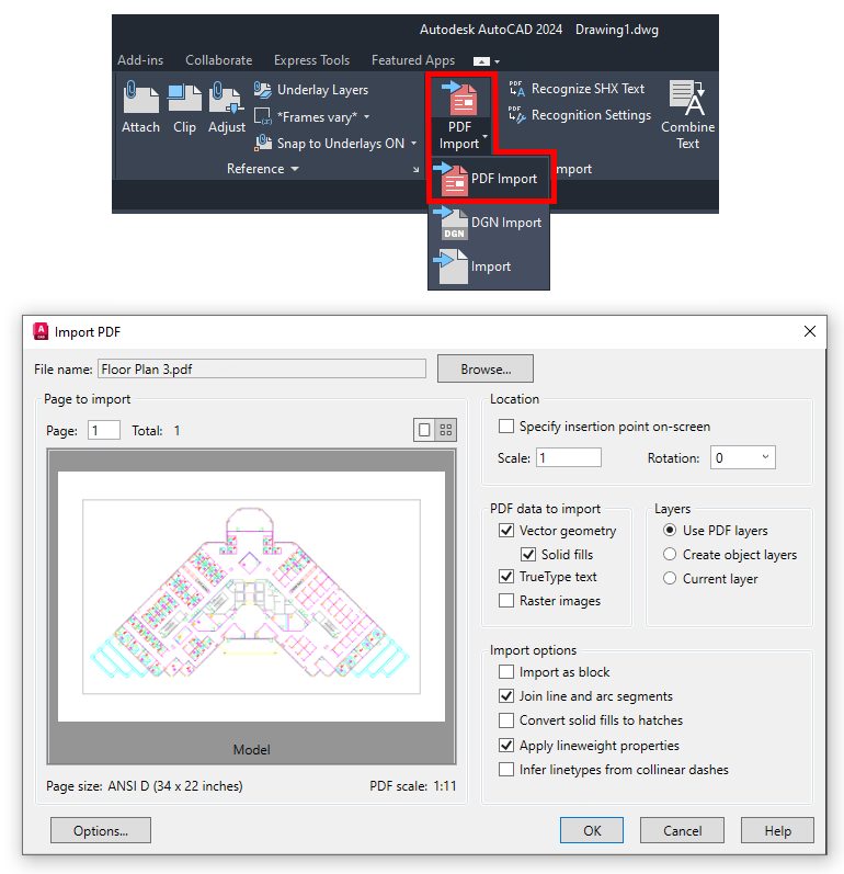 If the PDF was generated via a CAD or other vector-generating program, AutoCAD can import its geometry into your drawing, ready for you to modify and edit. To access a PDF file, you get started again in the Insert tab of the ribbon. In the Import panel, you’ll find the PDF Import tool. It’s a pulldown, so it might be set to Import DGN or just plain old Import. The command will display the Import PDF dialog, as shown below. There are lots of controls in it. I won’t go into all of it here, but that doesn’t mean I don’t have you covered in this previous article.