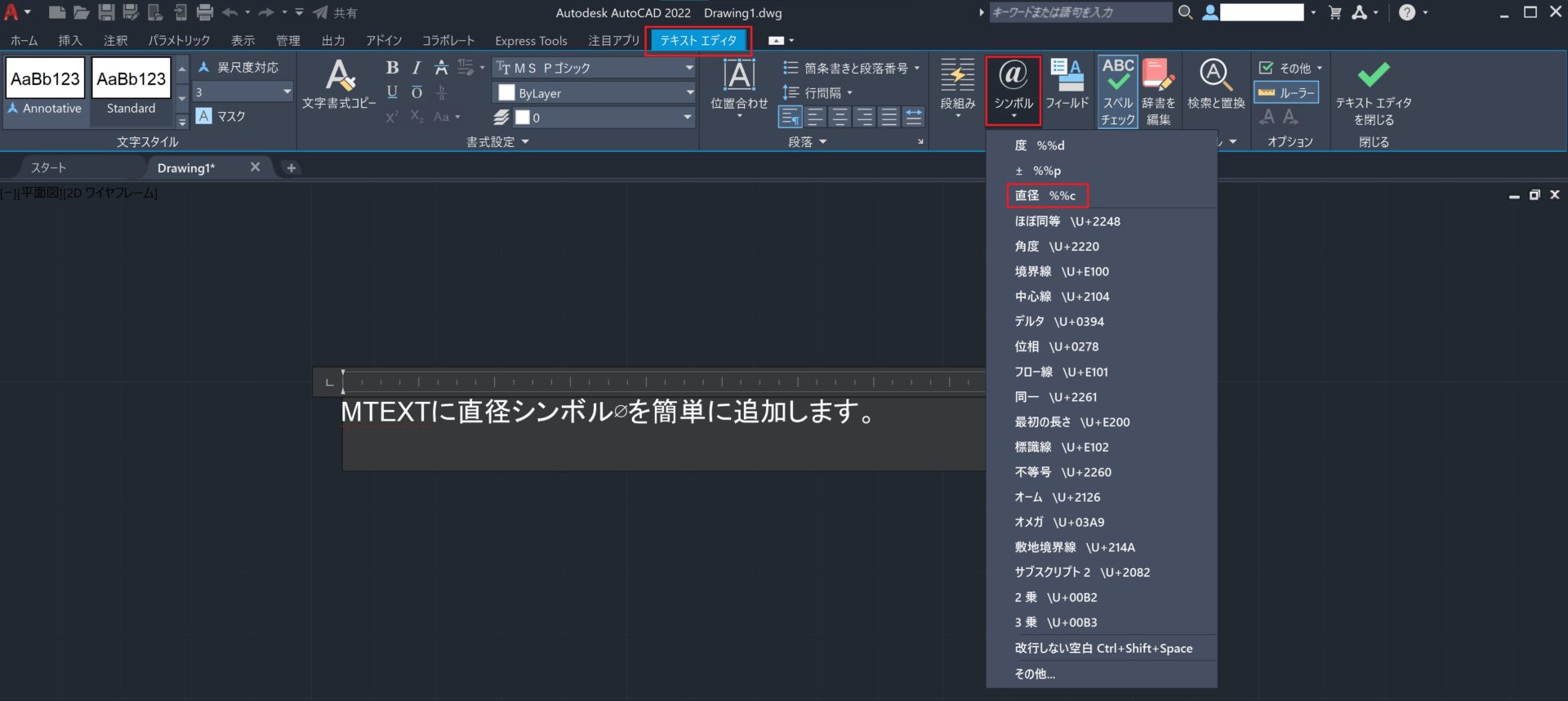 直径やその他の記号を AutoCAD 図面に追加する最も簡単な方法の 1 つは、[テキスト エディタ]リボン タブまたは右クリック メニューを使用することです。これらのツールは、マルチ テキスト オブジェクトや、マルチ テキストを使用した寸法、引出線または表を作成したとき、またはこれらをダブルクリックしたときに、自動的に表示されます。記号を表示する場所にカーソルを置き、[テキスト エディタ]リボン タブの[シンボル]フライアウトまたは右クリック メニューで[直径]を選択します。