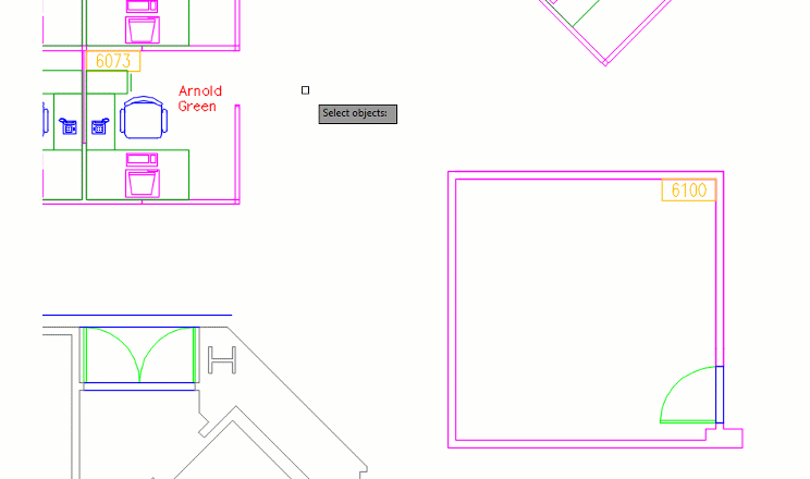 In any regard, below you can see an animation of how it works. Let’s say our task is to copy the furnishings from Arnold Green’s office number 6073 into the empty 6100 office, but aligned for the upper left corner. Your conventional move might be to copy the desk, chair, and equipment into the new office space, then rotate them, and then move them to the corner.